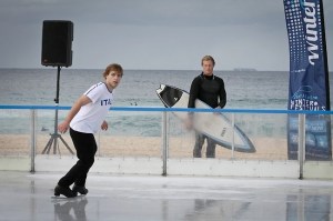The 900 metre square rink was constructed in 2011 as part of the Bondi Winter Festival.  The 18 oC  (64 oF) temperature wasn’t a problem, with the specially designed rink able to cope in temperatures up to 30 oC (86 oF).