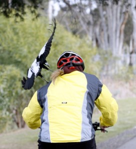Trust me – this is terrifying. Imaging riding along happily when all of a sudden you sense something coming at you fast from overhead. The next thing you know something has hit your helmet. The magpie flies off, only to come swooping back with its beak snapping for another attack. And another one. And another one.